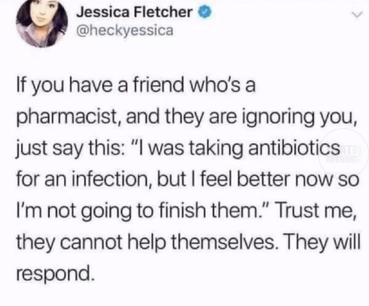 ickplant@lemmy.world to Science Memes@mander.xyzEnglish · 23 days agoLife pro tip for friends of pharmacistslemmy.worldimagemessage-square175fedilinkarrow-up11.22Karrow-down114