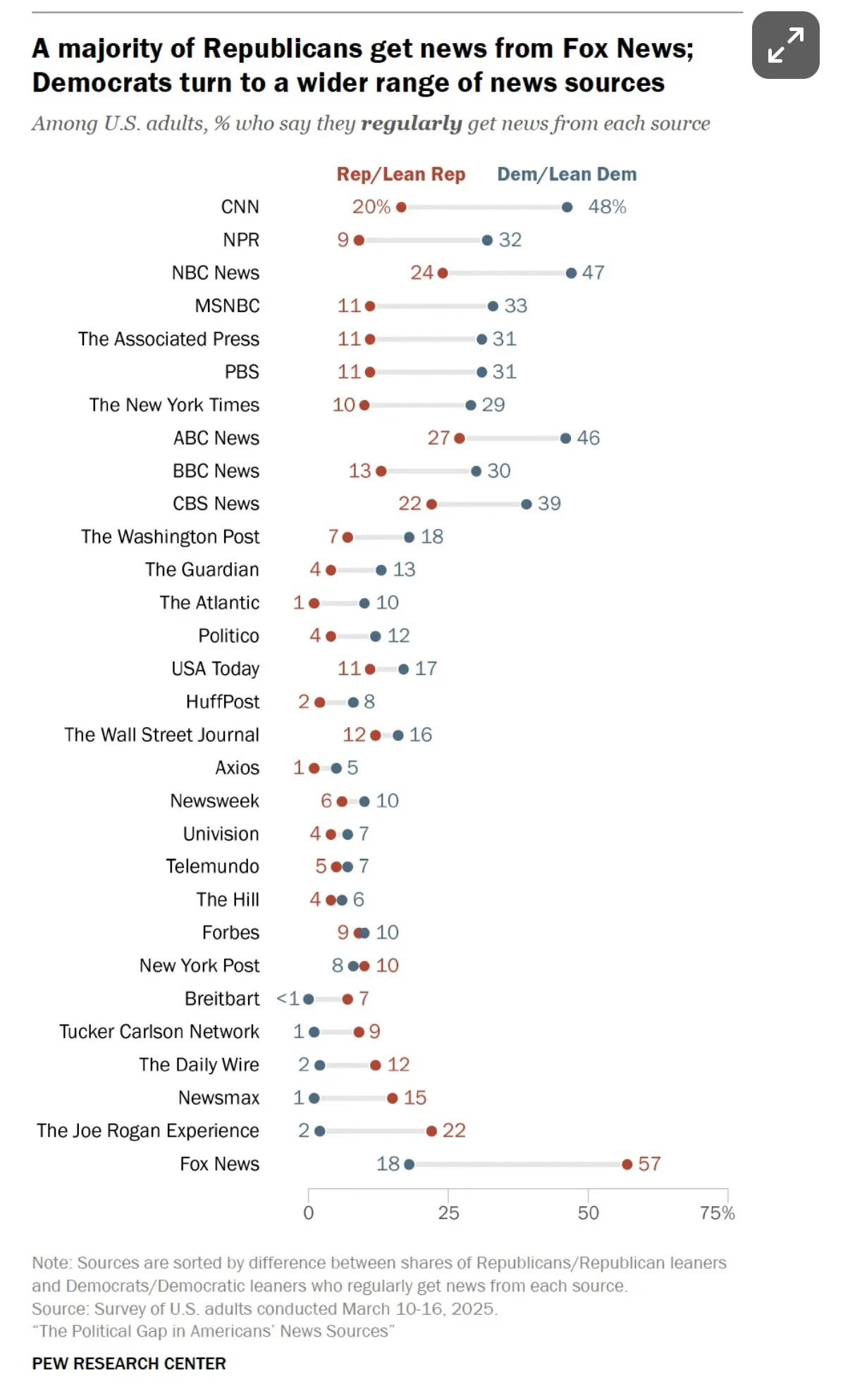 This doesn’t surprise me at all. I also expect that some younger Republicans are getting news from random, less popular right-wing podcasts or whatever. The Republicans I know basically either do that or pretty much exclusively use Fox News and occasionally Newsmax.