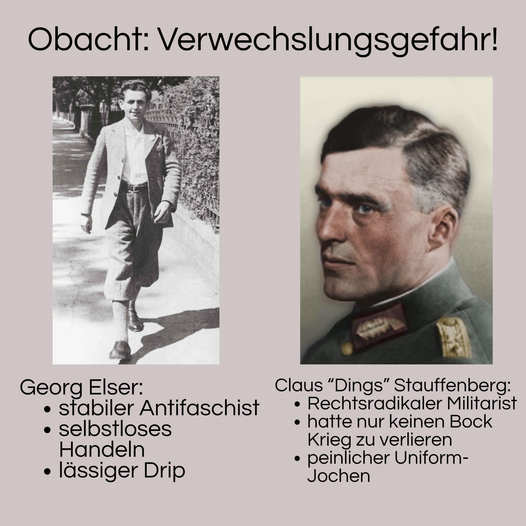 Dass das auf persönlicher Ebene immer noch jede Menge Mut erfordert hat, steht außer Frage. Das Meme ist eher ein Ausdruck an Frustration mit Mainstream-Heldenverehrung von Stauffenberg und seiner Gruppe die ideologisch doch stark bei den Interessen der alten Junkerklasse und Militärelite stand, während Georg Elser eher nur von Menschen mit zumindest etwas Enthusiasten-Interesse an Geschichte wirklich gekannt wird. Obwohl seine Geschichte aus meiner Sicht auch tatsächlich interessanter ist. (Ein Attentat auf Hitler planen, das knapp fehlschlägt, wenn man selbst in der Militärführung steckt ist mutig und interessant; Ein Attentat als Tischler ohne große Verbindungen planen, das auch nur knapp fehlschlägt, ist in meinen Augen halt tatsächlich Anerkennungswürdiger und interessanter.)