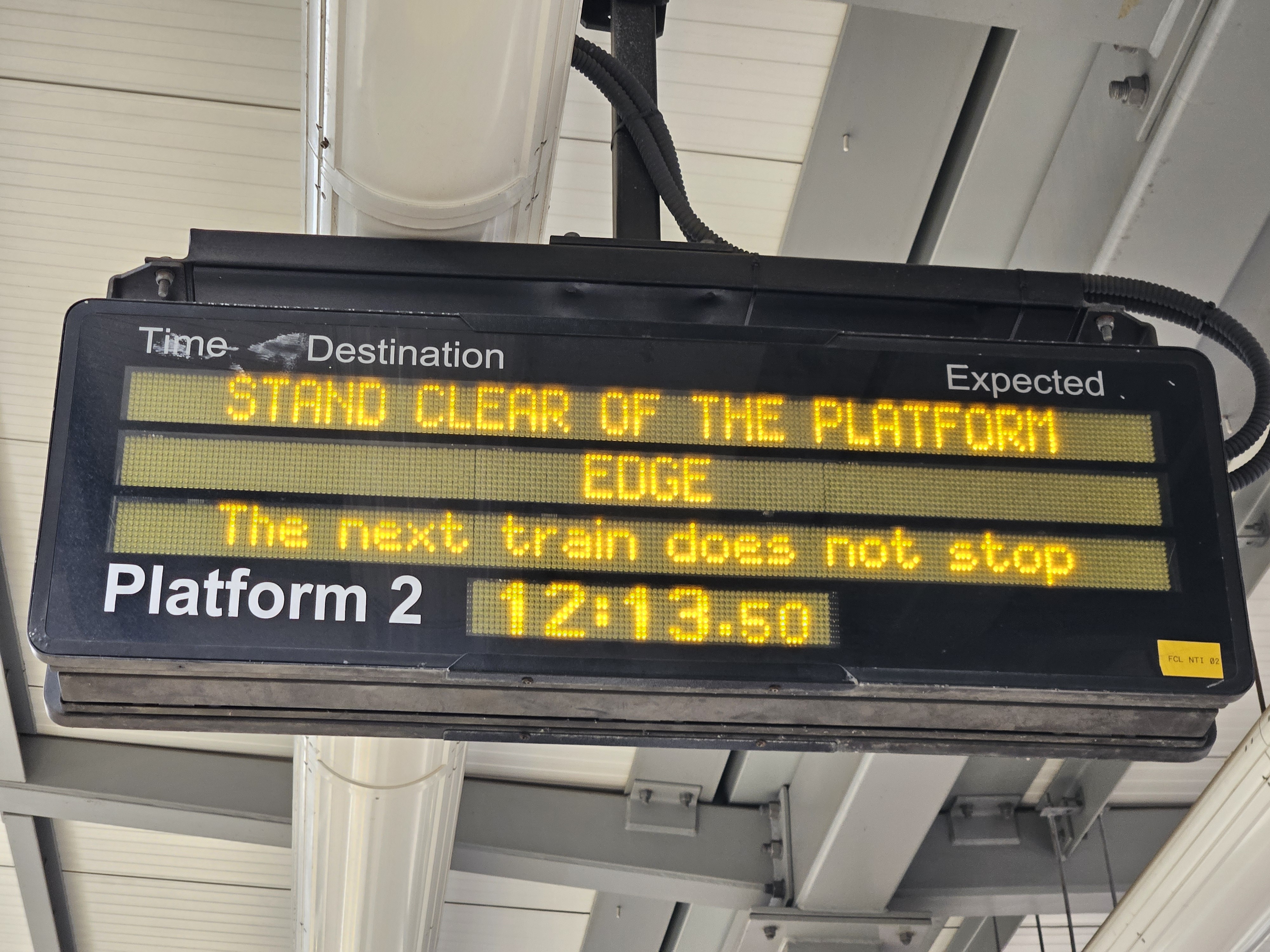“The 69 EC service TEKKNO TRAIN on platform A, and P, and V, to climax city is arriving ahead of schedule, we’re sorry for any lost enjoyment”