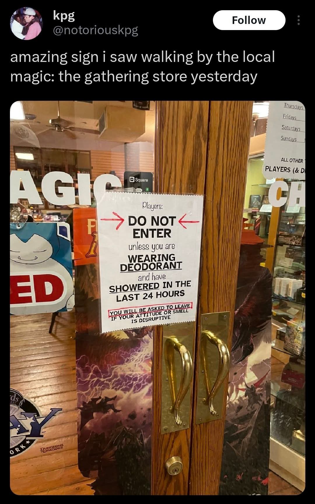 And this is clearly on a door to a card shop. Magic tournaments are infamous for individuals that have terrible hygiene.