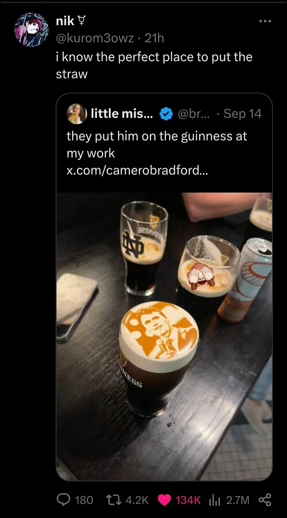 - If you’re drinking Guinness with a straw, you might be next - Never mind that. WTF have they decorated it with. You’re not supposed to add shit to Guinness. - These spray food safe dyes, wouldn’t affect t the flavor unless you’re overly sensitive. - I only ask because it’s the same colour as espresso crema, which would definitely affect the flavour.