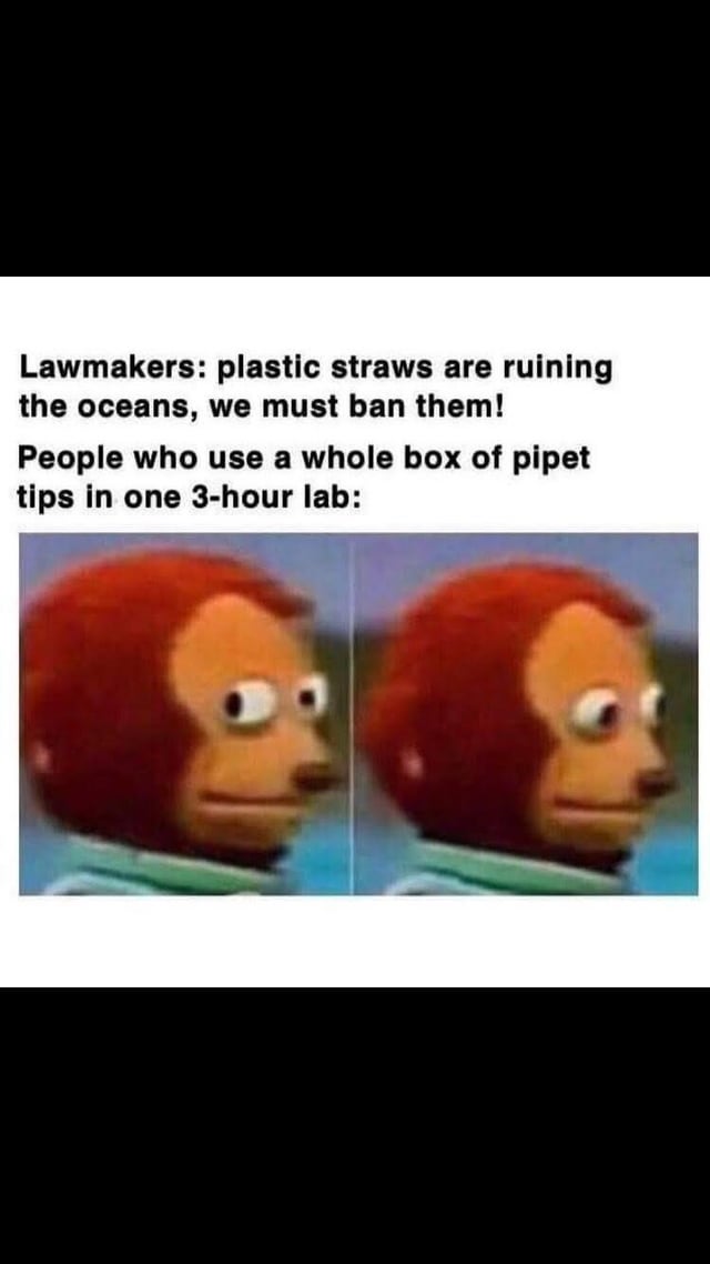 And we don’t throw pipette tips in the ocean, we throw them in the biohazard box. While not better for the environment, at least we don’t choke baby turtles.