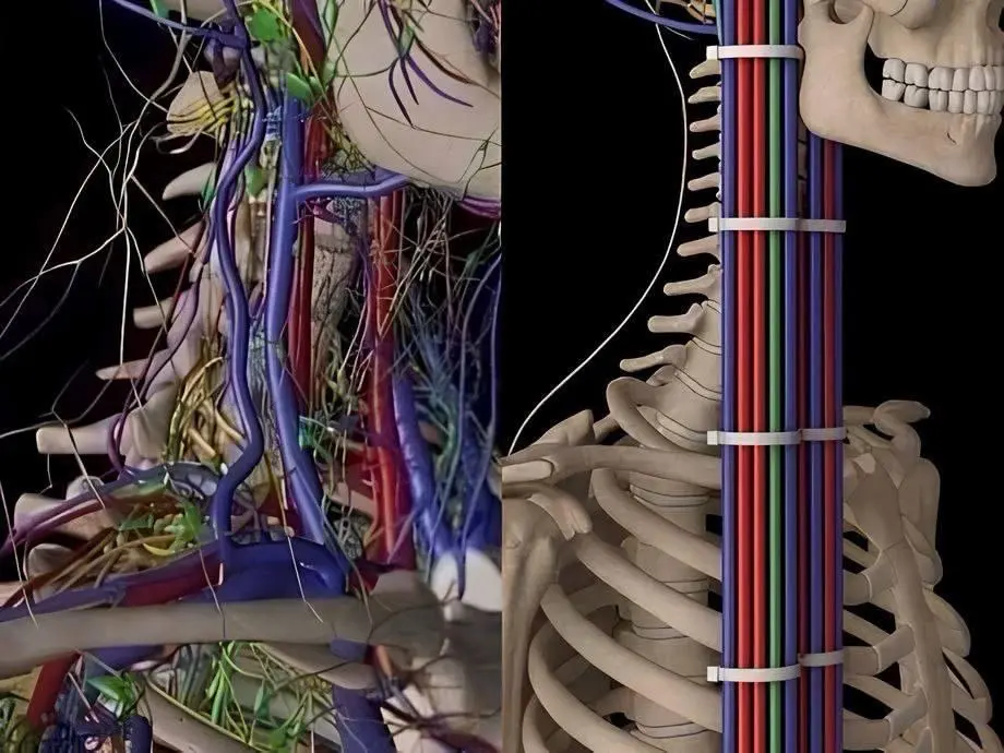 From one perspective, not binding the bundle to the spine follows a clean horizontal/vertical layout and isn’t tightly bound to the movement of the spine. This may be “shortest path” and save on cable cost. However, there could be conditions that would stretch the cable if it were only tied to the neck and hips.