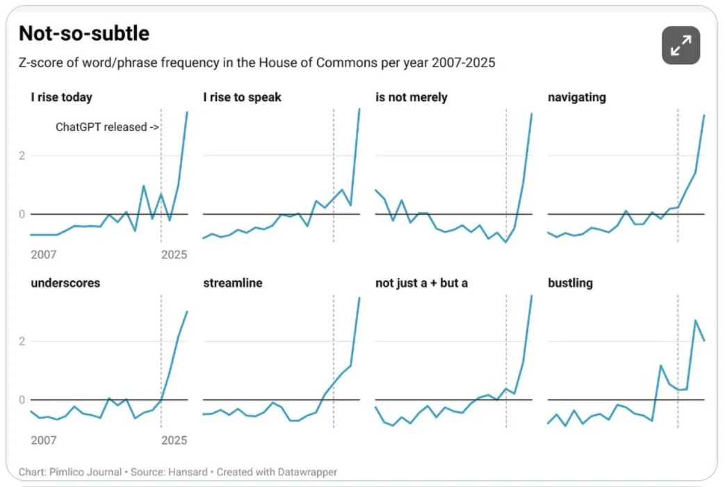 I think it’s a feedback loop. AI is trained off publicly available datasets like House of Commons records so popular words only get more popular the more AI slop is in there, since LLMs fundamentally just predict the next word given the context without much “logic” behind it.
