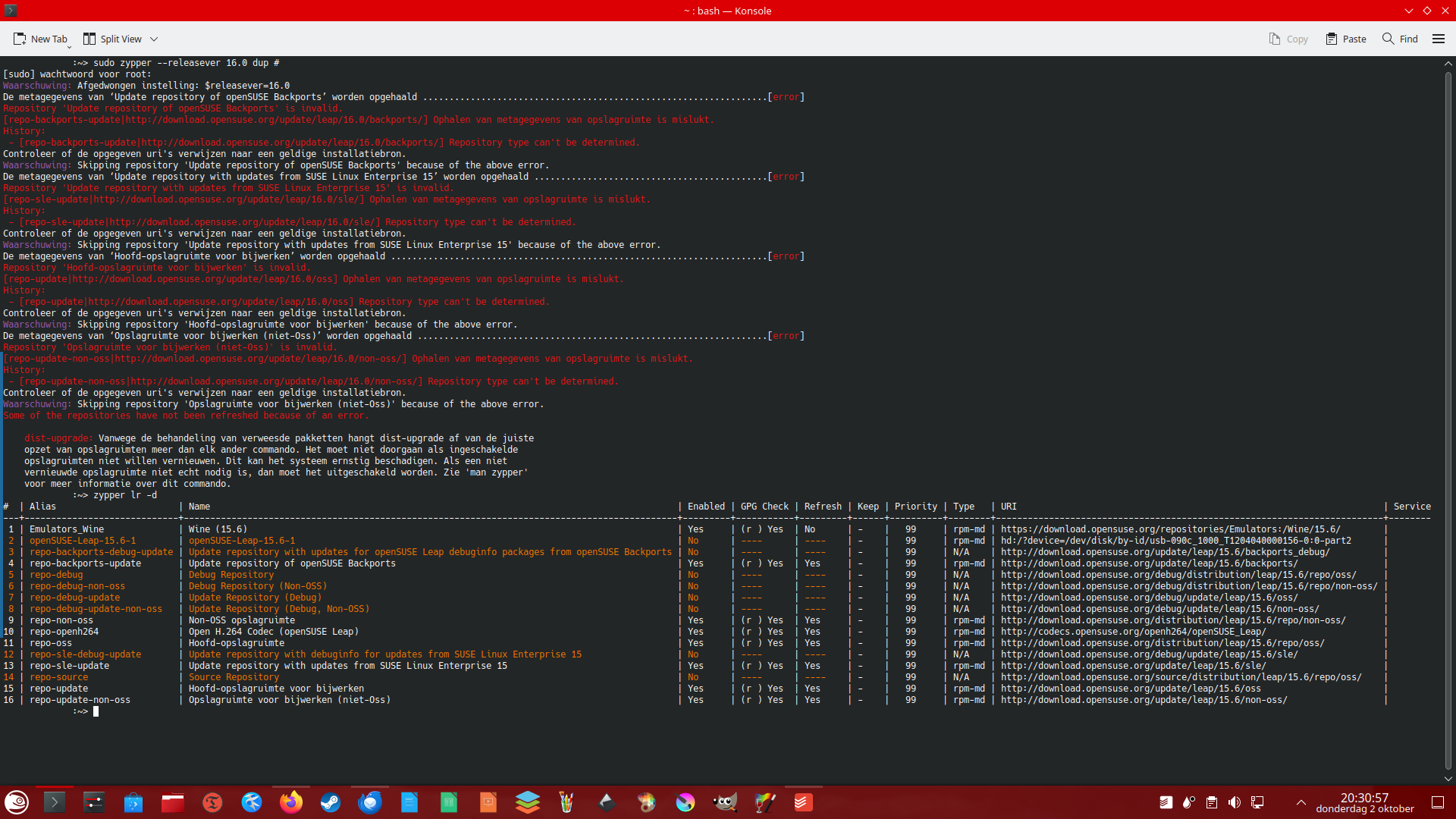 I don’t have much of a clue of what I’m doing, but I wanted to update to the new version of OpenSuse. It seems to not be possible, however, due to ‘invalid’ repositories. They are apparently ‘orphaned’, and when I attempt to open them I get web-pages with errors.