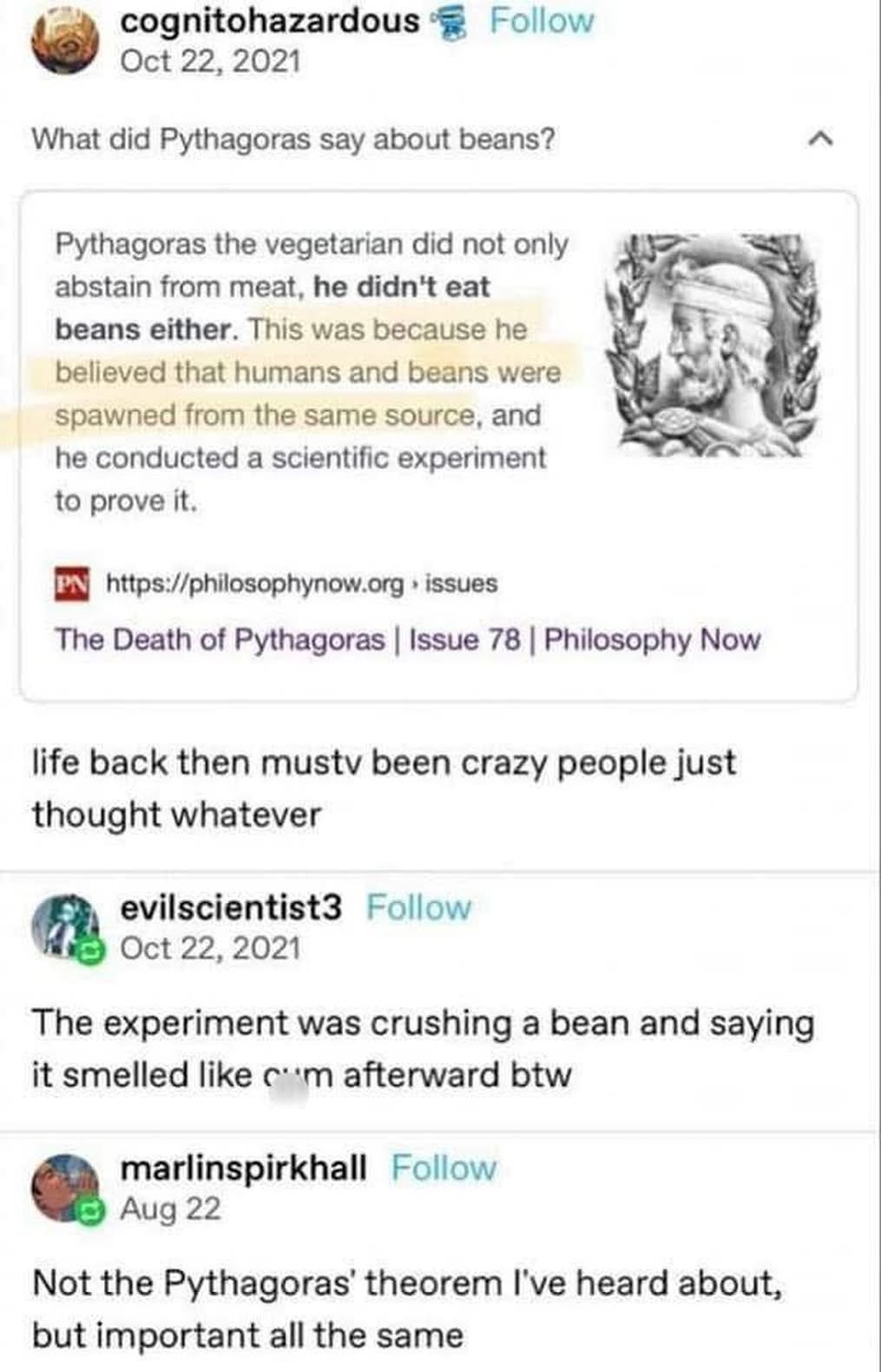 Pythagoras it’s human being, not human bean!!! Silly goose!