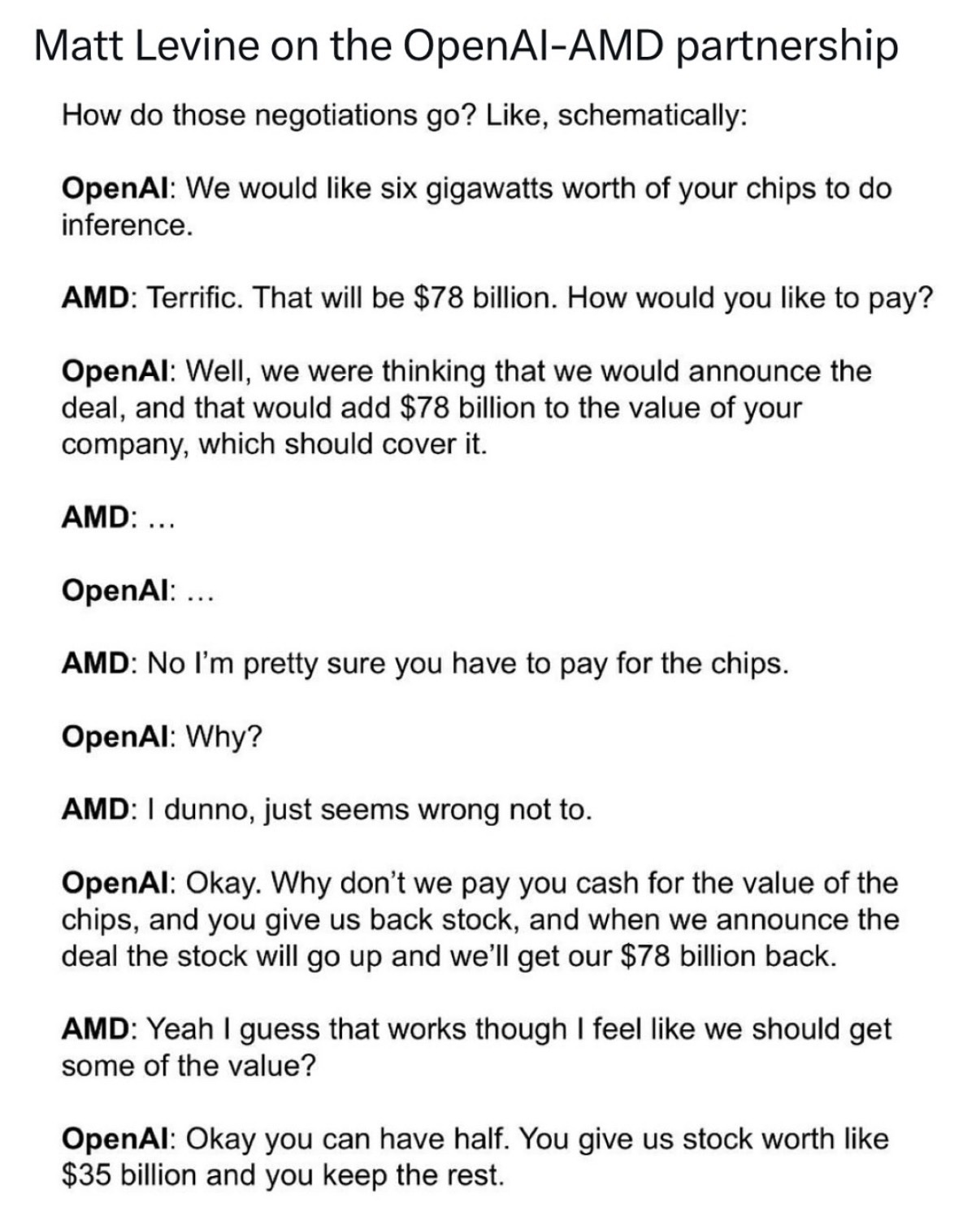 This is less a “vote of confidence” in AMD, because shit is free for OpenAI here. I too will buy all the AMD GPUs if you give me AMD stock of same or greater value. This deal structure actually makes AMD look terrible and unconfident in its product. But deal is not transparent enough.