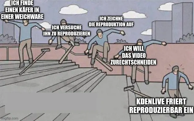 Ah kdenlive, man kennt es, schonmal versucht motion tracking damit zu machen auf clips die länger als 30sek sind? Man nehme einen 45sek 60fps clip, führe motion tracking out mit einem keyframe per frame, gehe auf “alle keyframes in zwischenablage kopieren” nun füge diese keyframes in einen effect deiner wahl ein und beobachte das program stürzen. Fix: alle clips vorher auf max 15 sek. länge schneiden…