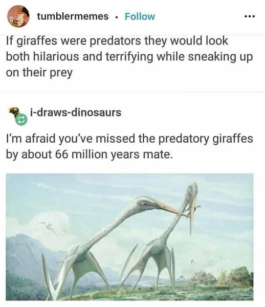 fossilesque@mander.xyzM to Science Memes@mander.xyzEnglish · 2 months agopredatory giraffesmander.xyzimagemessage-square36fedilinkarrow-up1626arrow-down12