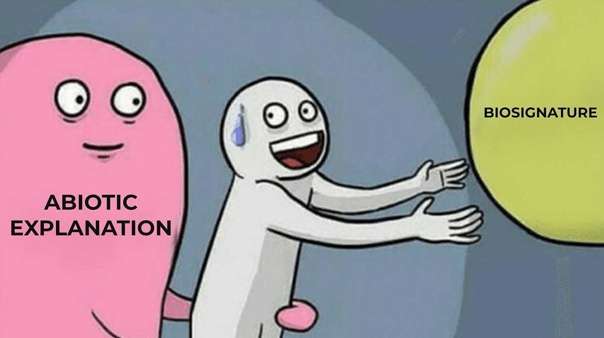 Telescopes pick up light from these planets, we then analyse the light to see what elements/compounds make up their atmosphere. Say there’s a planet which has a noticeable increase in atmospheric carbon, the scientist in the meme is tempted to say it’s evidence of life (Forrest fire, industrialization, respiration), but it could be a geological process (volcanic eruption)