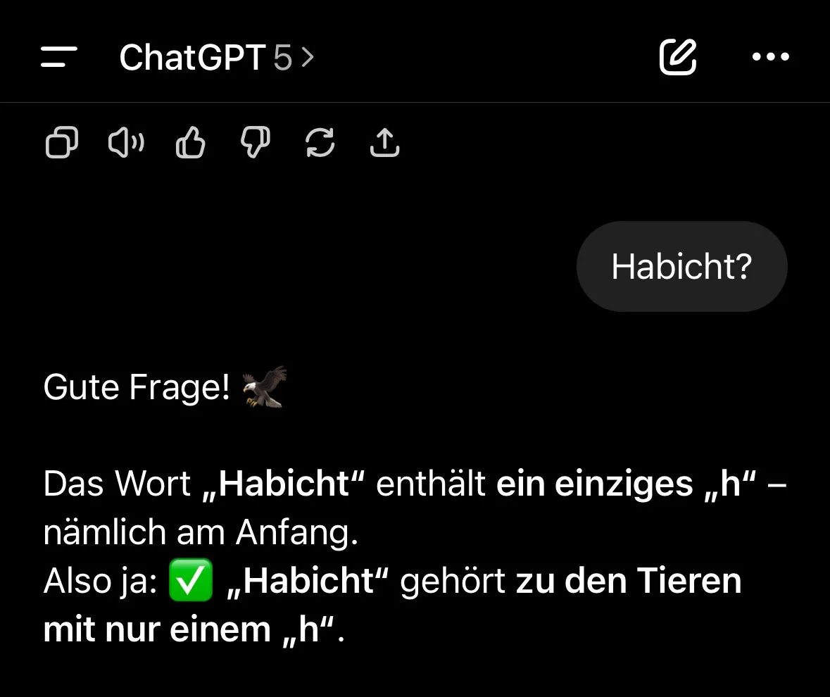 minus-squareAtoMops@feddit.orglinkfedilinkDeutscharrow-up2·21 days agoIst doch richtig. Nach “h” hast du ja nicht gefragt.