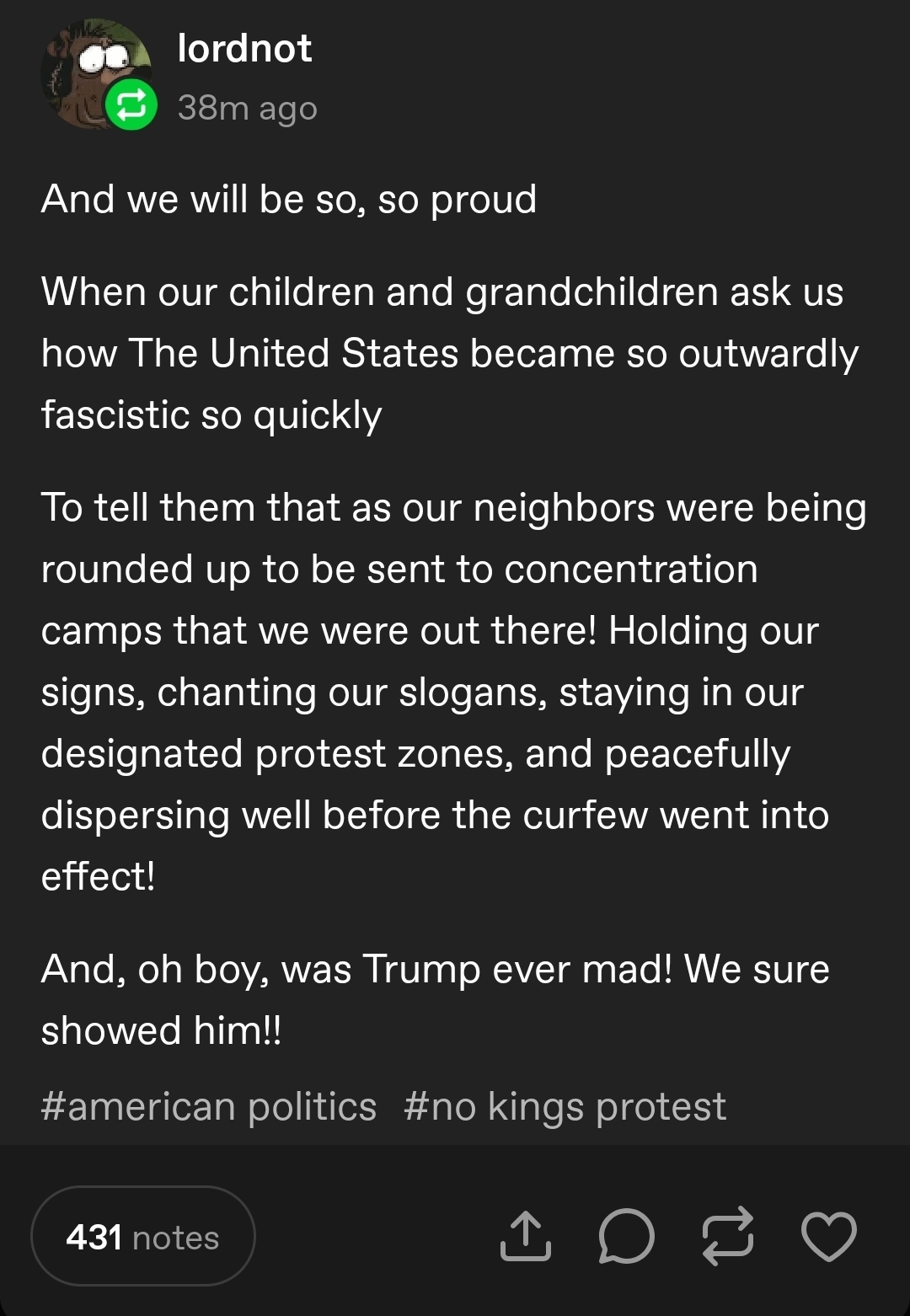 I think of peaceful protests as the flashing red CHECK ENGINE light of the country, and we’re all barreling down the highway at ninety with the gas pedal on the floor saying “Well, it’s not like anything bad has happened yet!”