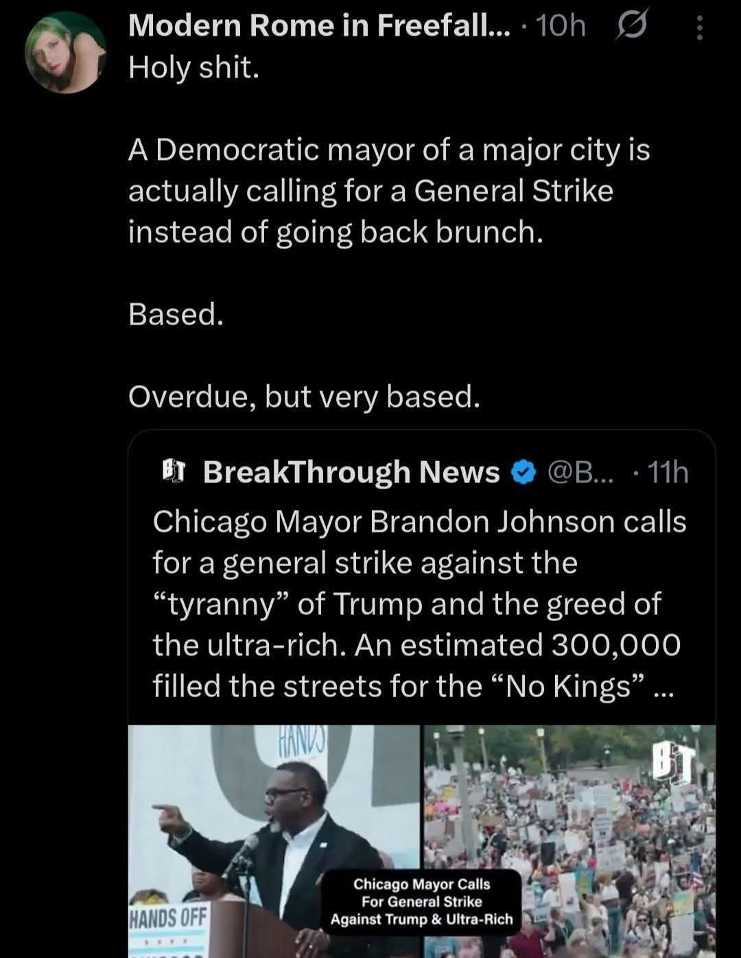 I’m down for a general strike. I’ve got to munch through my canned food anyway. Winter will be a bitch if the Cheeto in Chief sabotages power, though.