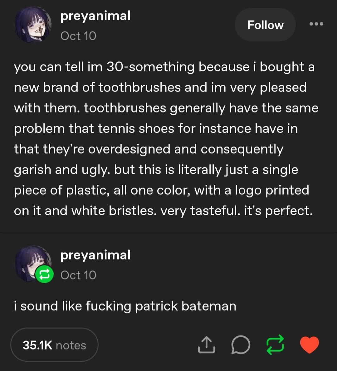 90% of microblogging is politics. I’m very happy to read Patrick Bateman type detailed appreciation.