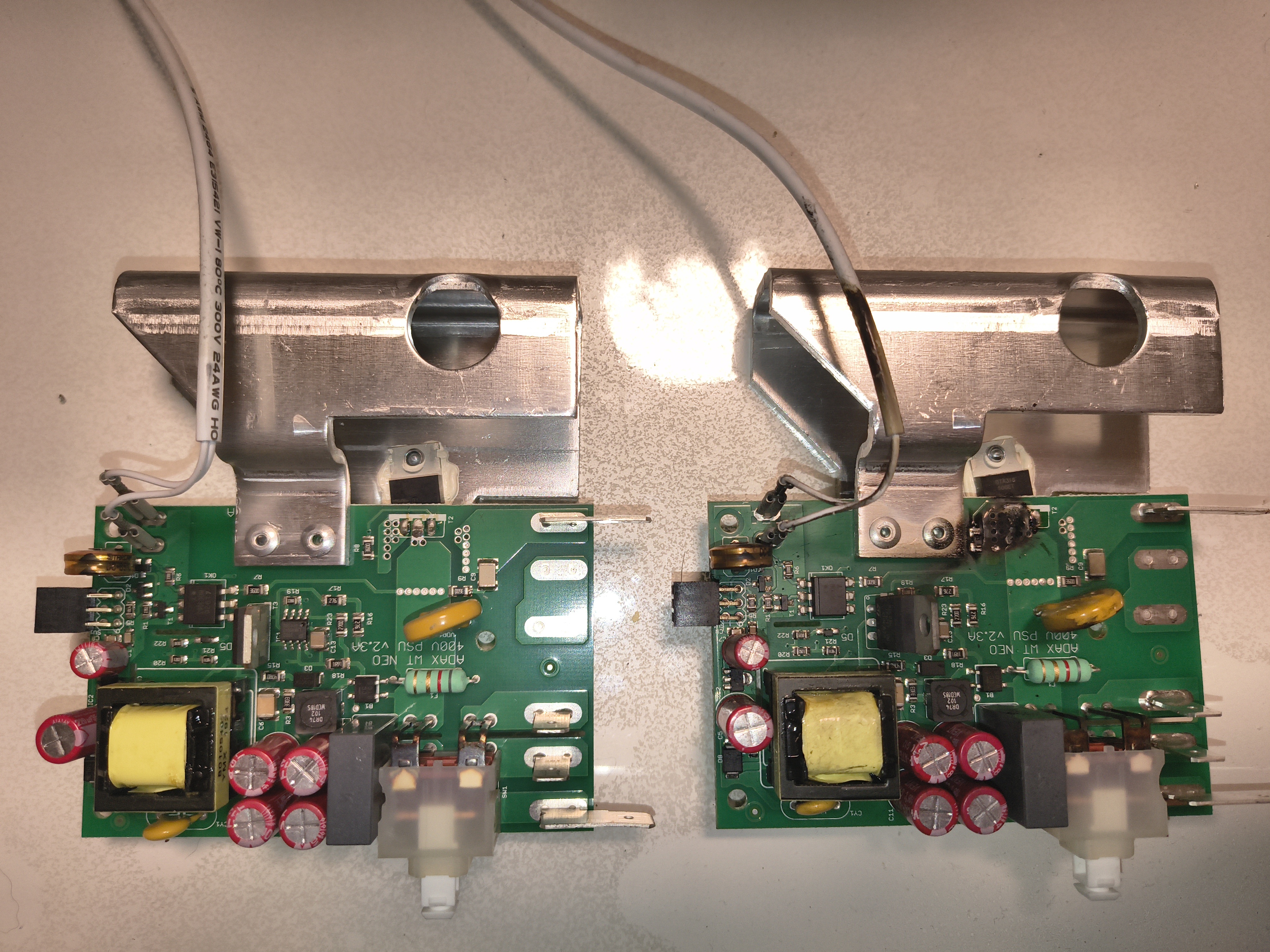 The terminals on triac in the power supply on the right shorted out during the night, luckily the occupant of the room was awake, because this happened in a bedroom. The power supply on the left was pulled from a functioning heater for reference.
