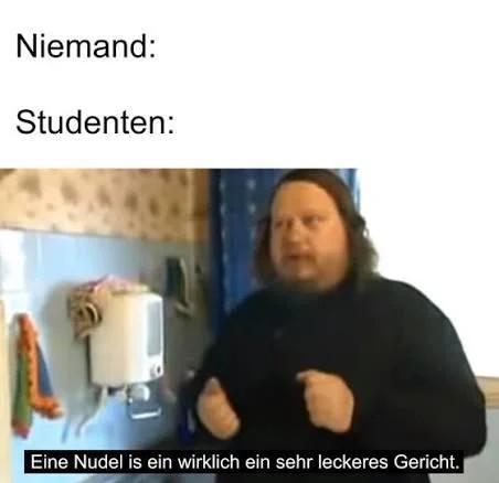 Einer ist gerade morgens aufgestanden, isst, äh, gerne Nudeln, der macht sich auch morgens Nudeln. Kein bisschen.