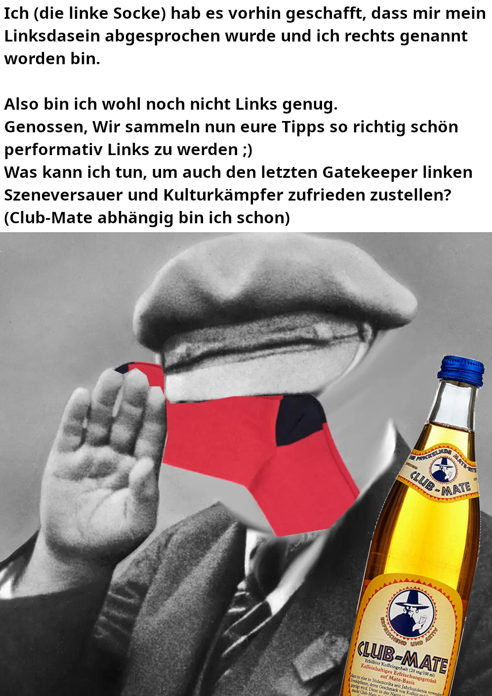 Club-Mate ist auch ein kapitalistischer Konzern, der seine Arbeiter*innen ausbeutet. Ich als echte Kommunistin trinke nur Leitungswasser.