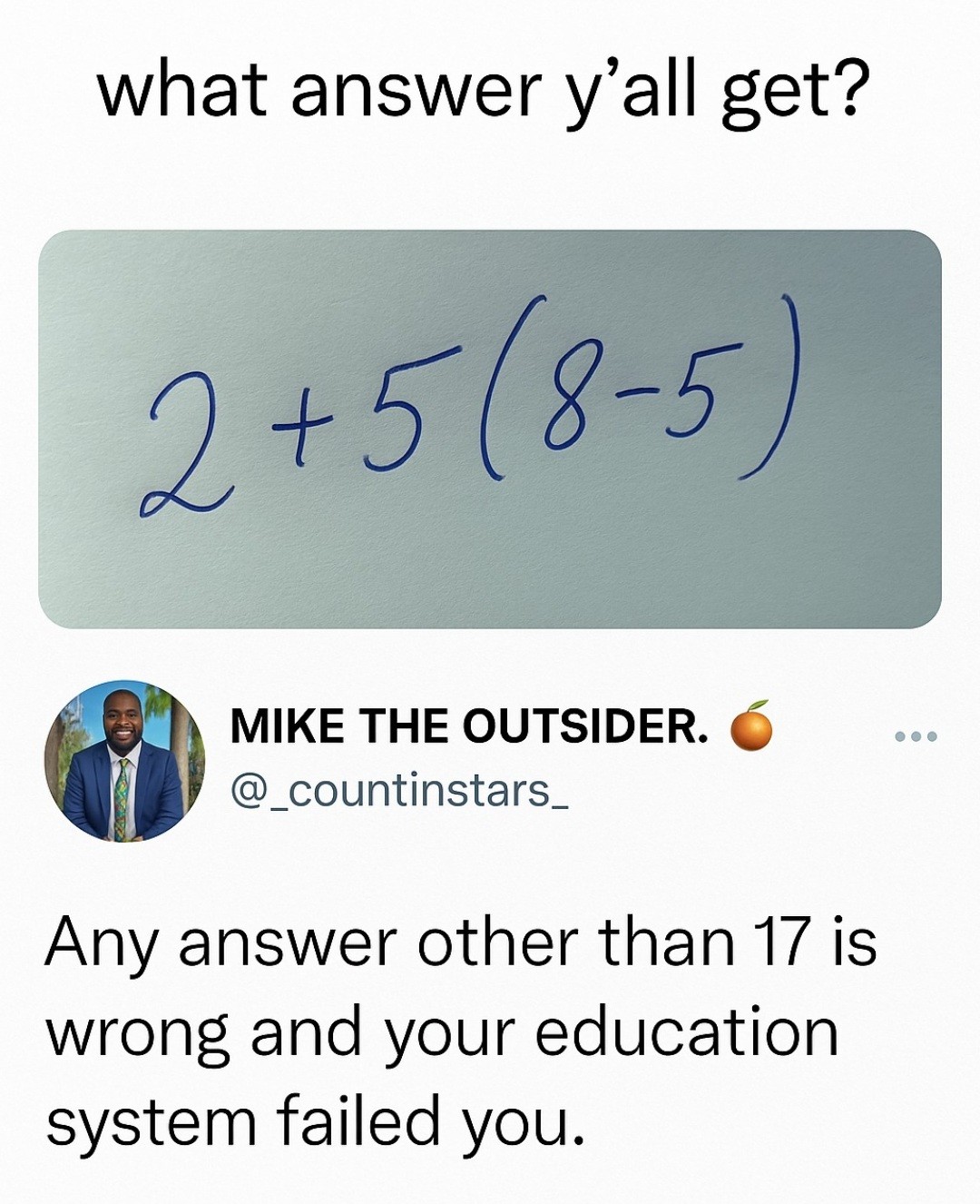 minus-squarex4740N@lemmy.worldlinkfedilinkEnglisharrow-up1arrow-down22·edit-27 days agoIts because its: 2+5×(8−5) My calculator app automatically added it when typing in what was in the image and “2+5×(8−5)” does equal 17. It’s absolutely the fault of the person making the social media media post for not writing it properly and confusing people.