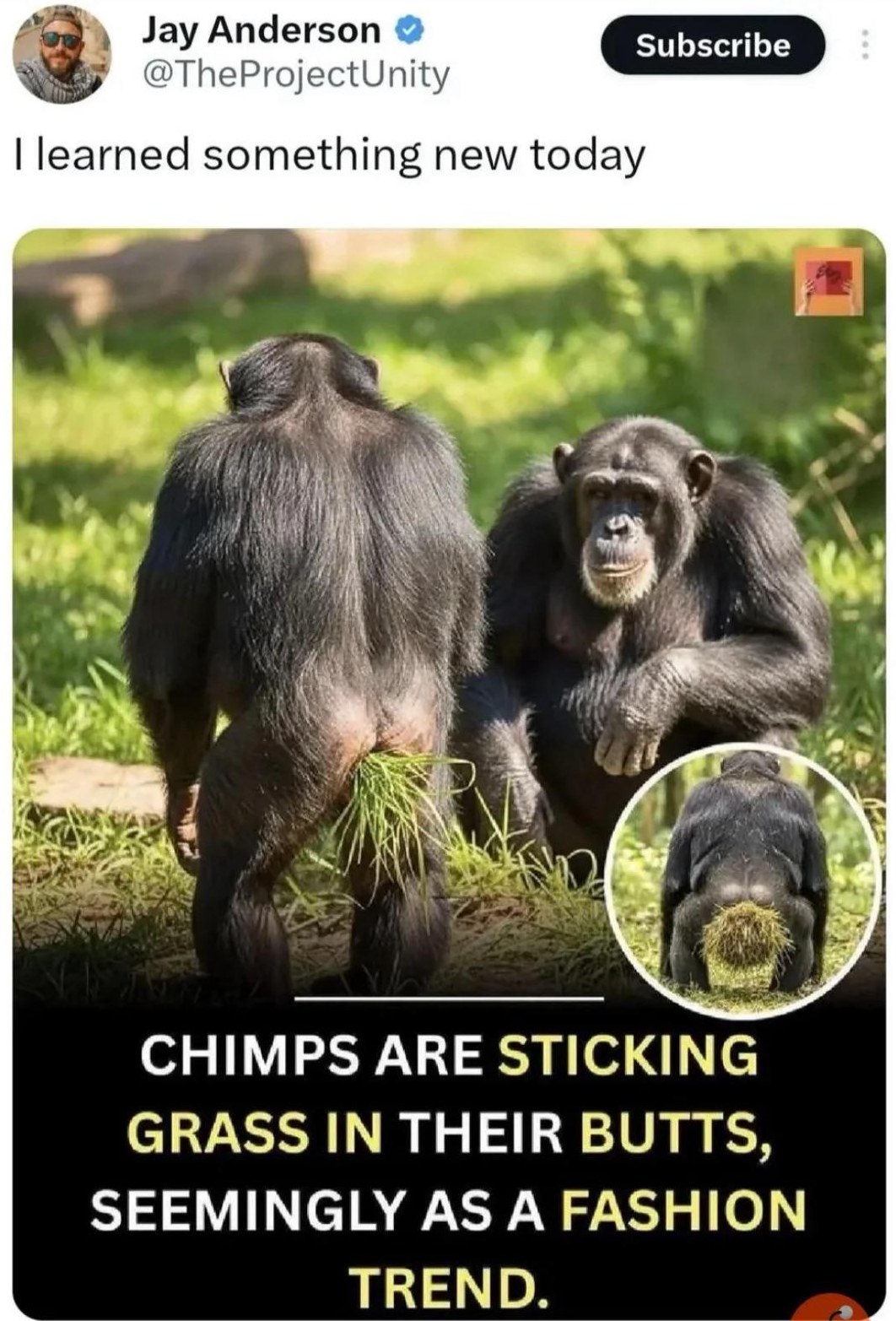 Some chimp, “I bet you can’t stick grass up your bunghole.” Some other chimp, “oh yeah, hold my banana, watch this.” Doubtless.