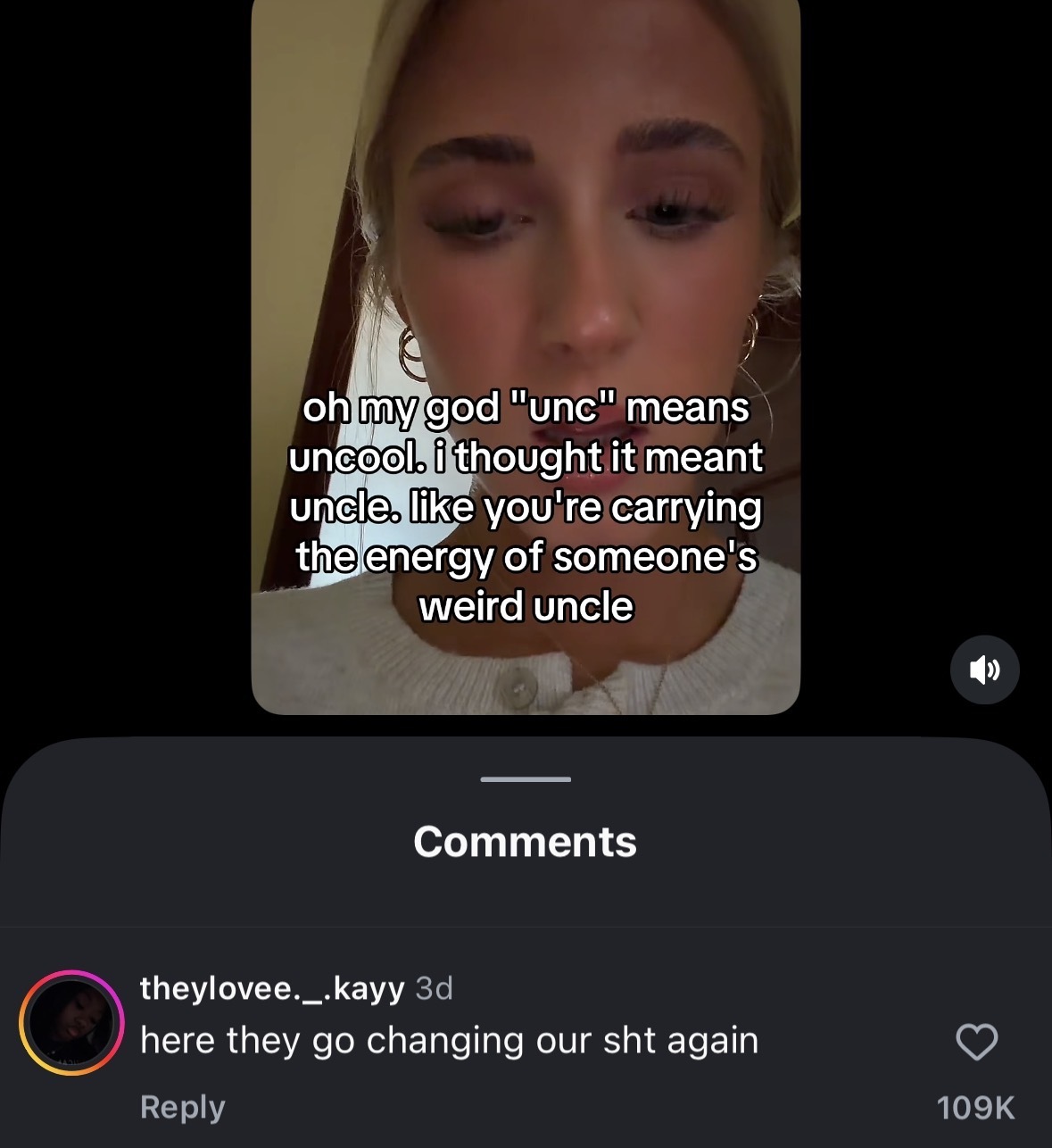 unc is also how black americans call each other in respect if its a younger person talking to someone whos their uncles age (like kuya in tagalog, but also like a literal uncle aka tito in tagalog), which is what they mean about changing “our” shit because we are seeing white people changing the meaning of unc to no longer be respectful, juat like white people changed the meaning of woke. White people dont hold white people accountable for stealing shit without attribution, just like rock and roll. Black people call each other brothers and sisters and uncles and aunties for a (hopefully) obvious reason that shouldnt neat repeating. If you cant intuit it, you had a poor education regarding slavery in america.