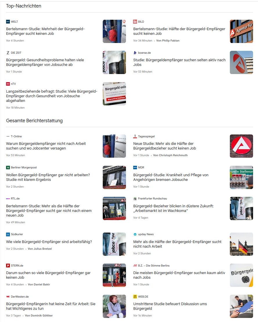Die einen so “Bürgergeldempfänger arbeiten nicht, weil faul”, die anderen “Bürgergeldempfänger arbeiten nicht, weil krank” und web.de dann so “Umstrittene Studie befeuert Diskussion ums Bürgergeld”. Ich bin mir nicht sicher ob das Clickbait ist, weil es der Dramatik nochmal eine zusätzliche Dimension gibt, oder Metakritik an der unterschiedlichen Berichterstattung.