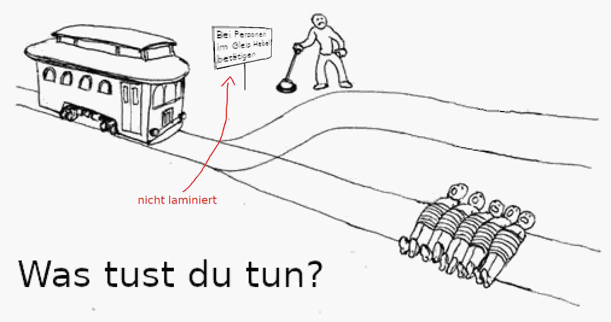 Ein Straßenbahnfahrzeug ist über zu überfahren 5 Personen gebunden zum Gleis. Es befindet sich noch vor einer Weiche. Du stehst am Hebel neben der Weiche, daneben ein Schild “Bei Personen im Gleis Hebel betätigen”. Es ist nicht laminiert. Was tust du tun?
