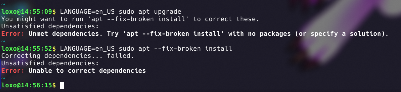 What’s the output of apt —fix-broken install, like the big red error message suggests?