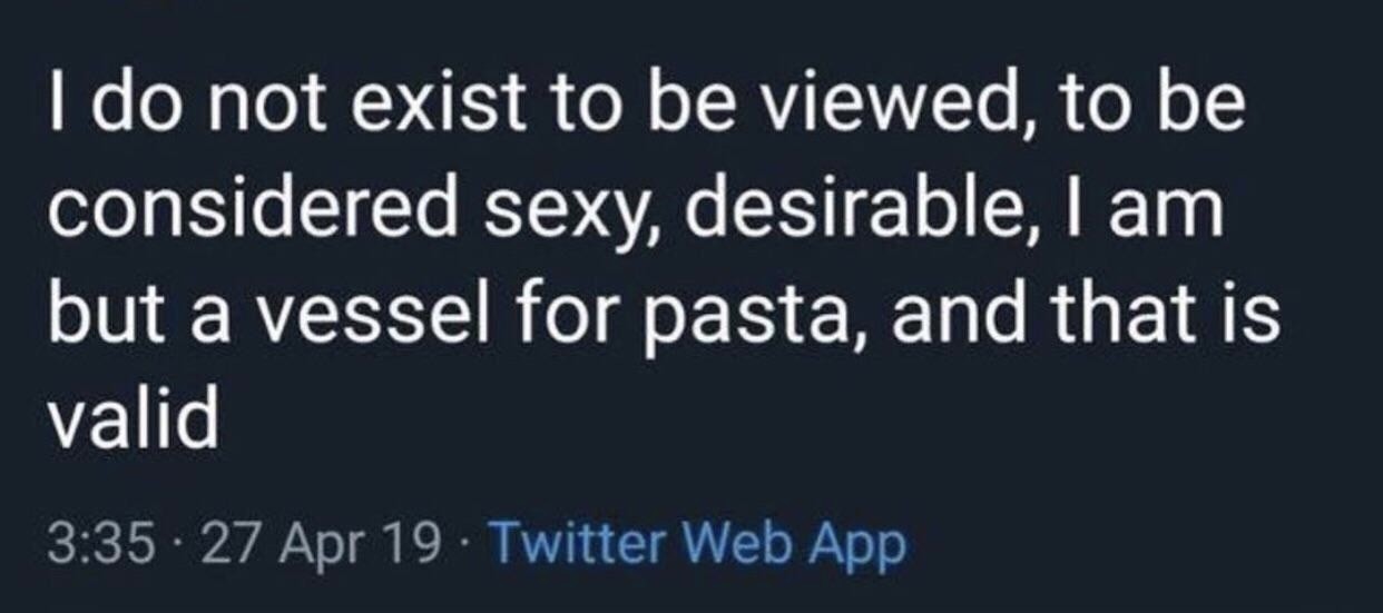 Sexy pasta deserves a sexy vessel, you miscreant!