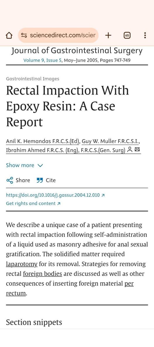 You’re right it was crazy to read. It’s wild what people will do, I was actually impressed by the other case they cited that was similar where a guy got concrete poured in and it cured. They were able to give him relaxers and get the concrete out without surgery. Too bad the glue stuck to the inner walls and couldn’t get taken out without surgery. What an absolutely wild thing to put up your ass though - like I’m not here to shame anyone but just put stuff up there that’s not gonna fucking kill you.