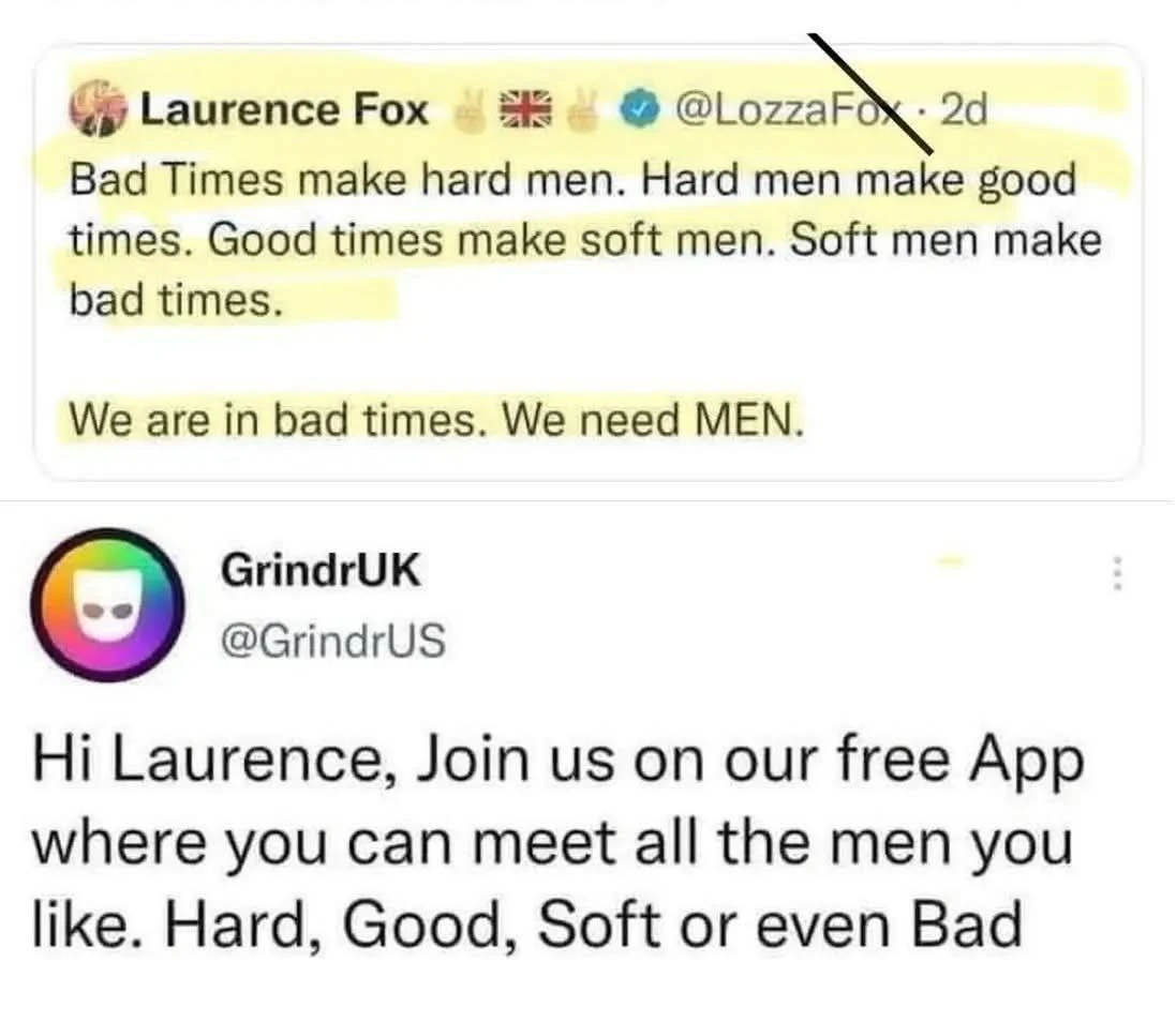 Most of what makes these “bad times”, involves the existence of massive dickheads like Laurence Fox, who think that strength is the same as bigotry.