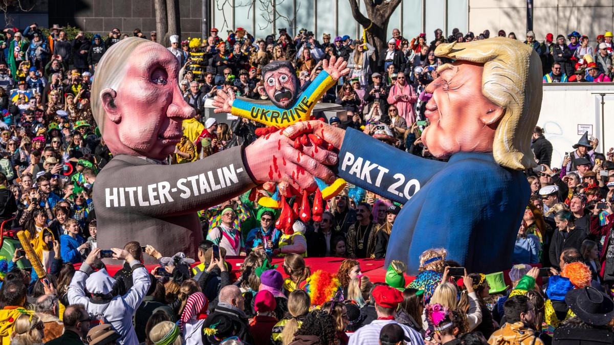 This year’s float for the Düsseldorf carnival depicted Trump and Putin shaking hands, with President Zelensky crushed in their grip and haemorrhaging blood, along with the caption: “Hitler-Stalin pact 2.0”.