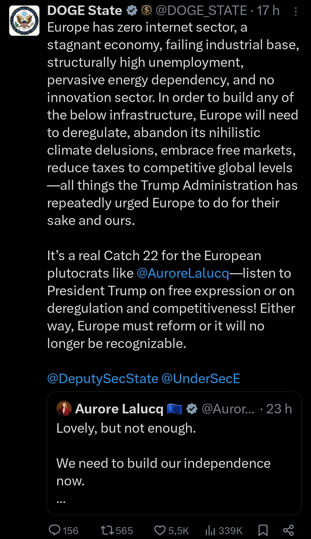 arrow-up160arrow-down1imageOfficial US Diplomatic account openly mocks EU Parliament Member Aurore Lalucqsh.itjust.workspavibiv@sh.itjust.works to Europe@feddit.orgEnglish · edit-215 days agomessage-square10fedilinkfile-text