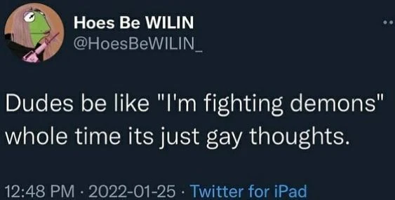 transcription: dudes be like “im fighting demons” whole tie its just gay thoughts.