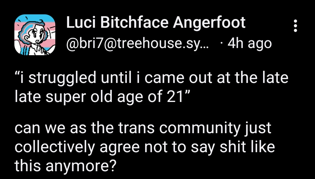 Yes trans folks first puberty was wrong but its not unworkable at 20, 30,40, or even 80.