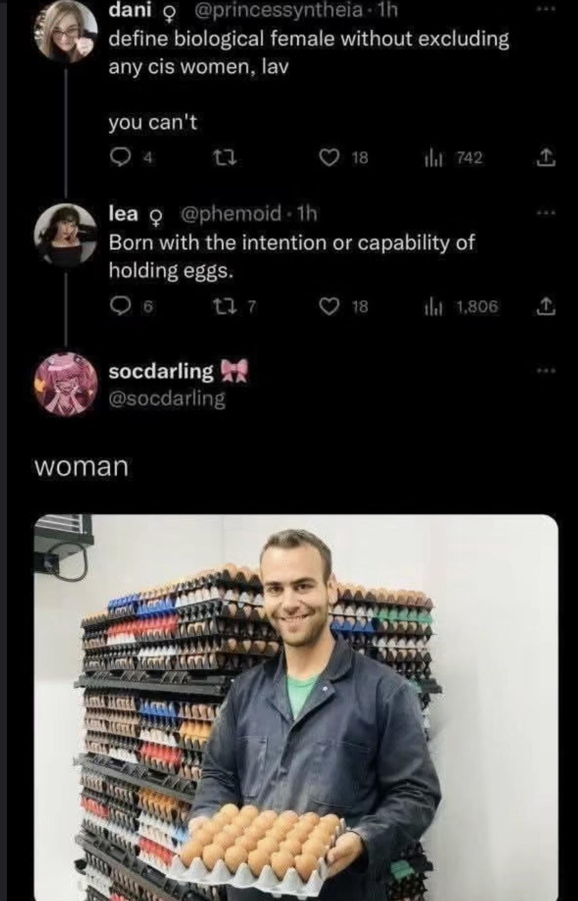 It’s always funny when people try to define terms and they try to rip off the style of dictionary entries despite not having the same mastery of English as dictionary writers. Just saying “born with the capability of holding eggs” didn’t sound dictionary-y enough to her, so she tried to add more to make it sound more badass and legit. But saying anyone is born with the intention to hold eggs is the most ridiculous and obviously flawed part of her whole argument, which would have been better off if she just left it out. But nooooo I need to sound super smart.