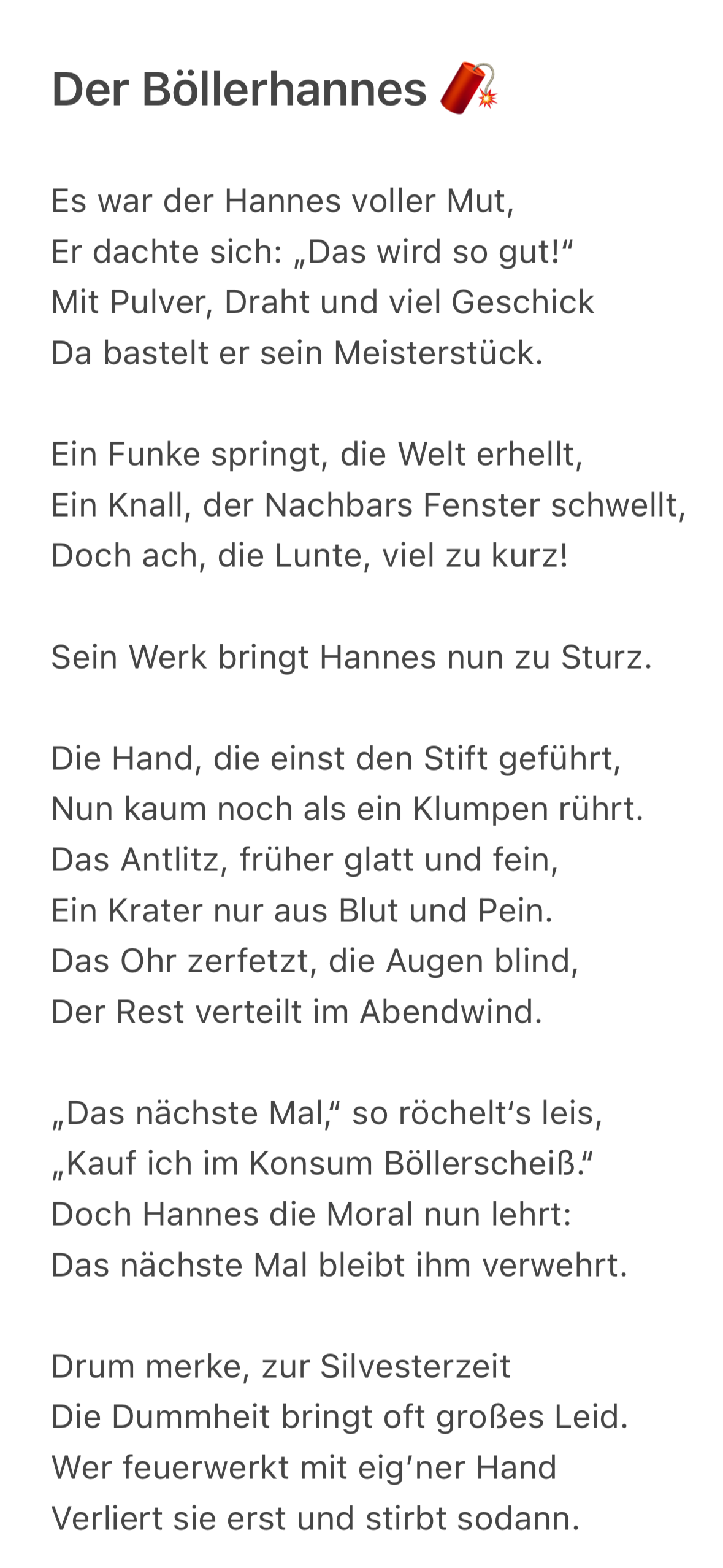 Doch Hannes die Moral nun lehrt: