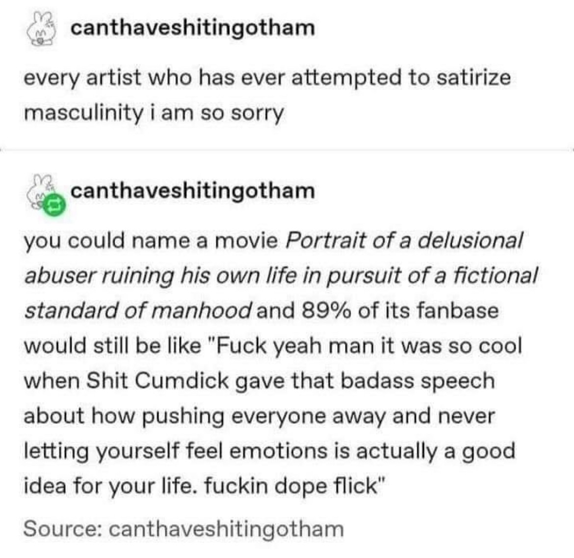 I agree, but at the same time I am frustrated that men aren’t able to critique masculinity, even when they do it quite well, without being ignored as “cool manly man sacrifices himself to avoid bothering his loved ones”.