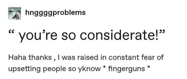 ngl the only reason i’m ever nice to anyone is because i’m afraid of the consequences if i’m not nice