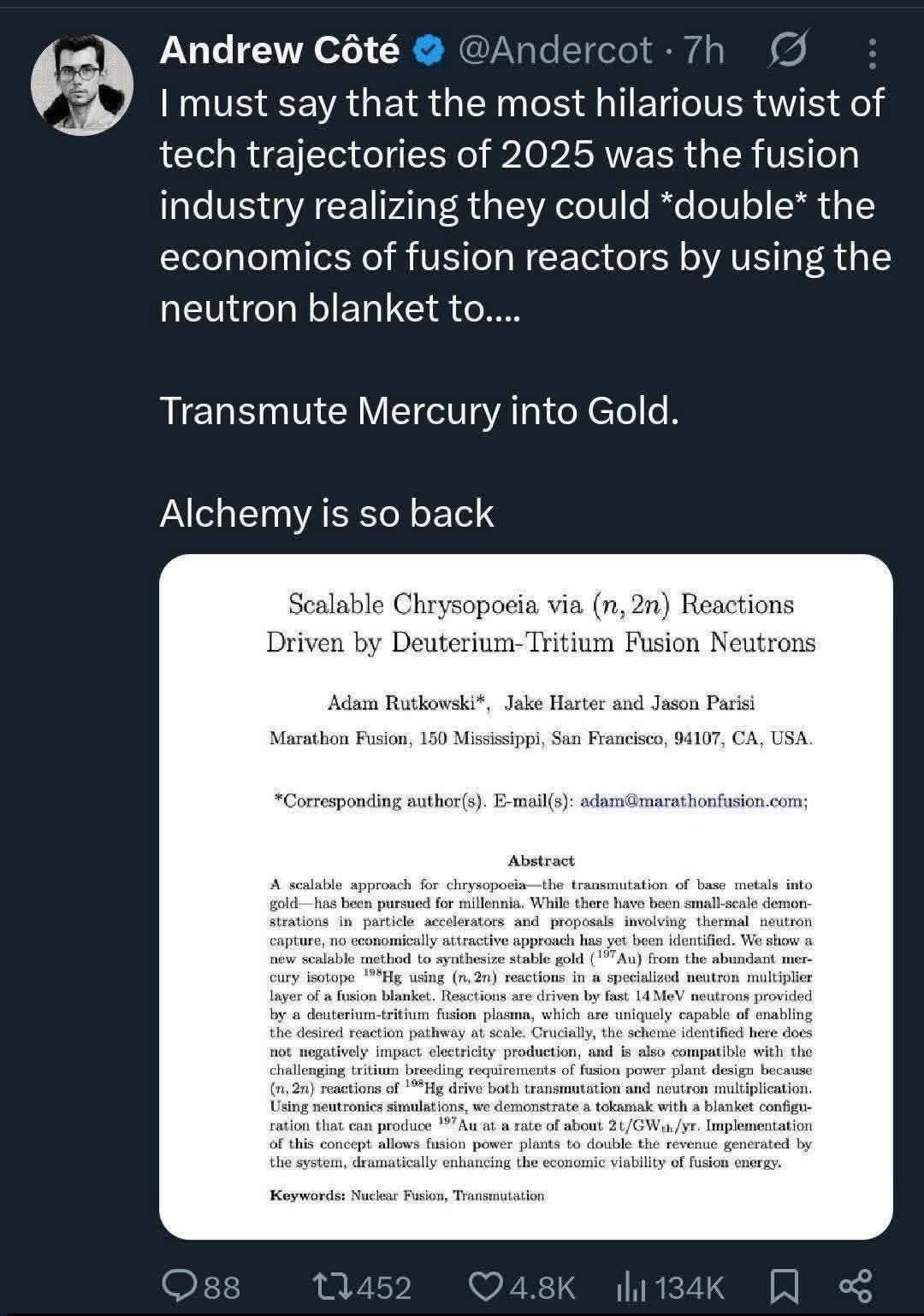in other words, considering that the gold market generates something like $350bn USD per year, and the total market value of “above ground” gold around $25tn USD, even if fusion reactors generate $1bn USD worth of gold it would have a negligible impact on the price of gold while providing significant value to the reactor operators (incentivizing the growth of the fusion reactor industry)
