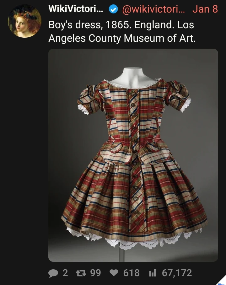 A twitter post picturing “boy’s dress”, made in 1865, England. Currently at L.A. County Museum of Art