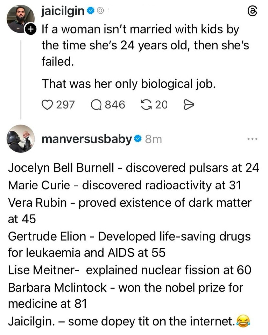 Even better is that this argument, the “most fundamental purpose”, when applied to humanity actually means that the “aberrations” that fundamentalists hate most are actually an integral part of the system. LGBTQ+ and the neurodiverse (ADHD, autism, ect) all benefit the growth of the species. Having members that contribute to the strength of the species, who can fight, gather, and assist with the offspring of others without creating their own competitive offspring is a massive advantage when resources are limited. The fact that those same noncompetitive (offspring wise) members can breed if something disastrous happens to the rest of the breeding stock is such a brilliant design that it makes a lot more sense to use that as an argument for “intelligent design” rather than the other shit that is usually dragged out. As for the neurodivergent, having members that think differently and are driven to try things that would be considered outside of normal range is really the only option for growth once the “normal” resources reach capacity.