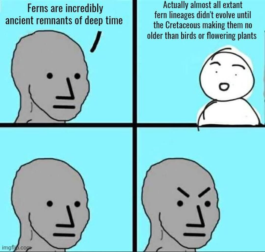 When I call a fern (or wolf, crab, crow, whale, shark), at that level of syntactical broadly used common word I’m mostly talking about the phenotype, not the genotype. If someone was saying something about a specific fern, then we can argue against those romantic idea of deep time, a little. I mean, we’re probably all descendants of some ancient panspermia event anyway if you want to feel some connection to the ancient forgotten past.