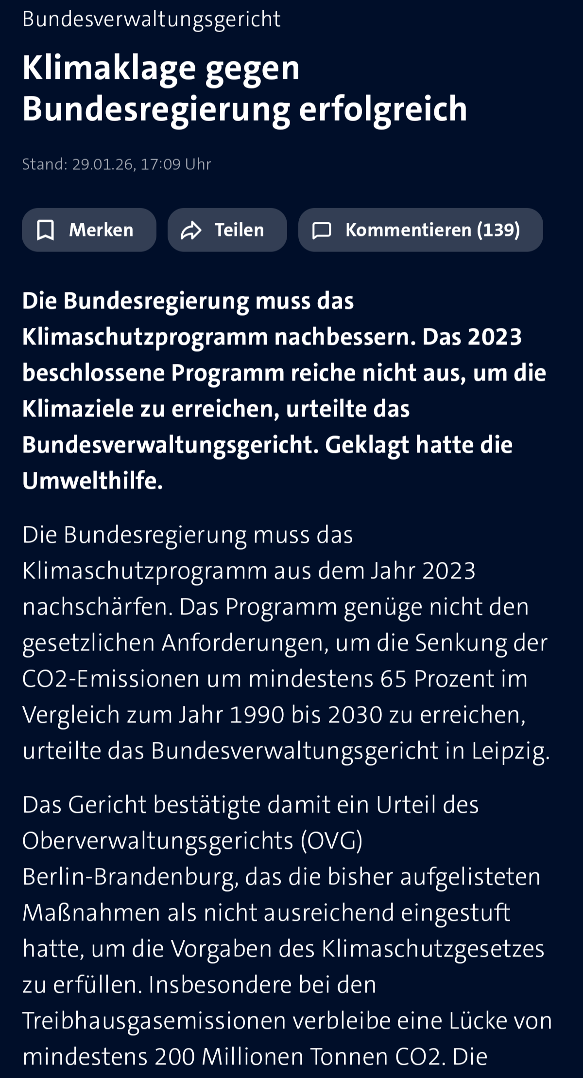 Das wirklich absolut bekloppte daran ist ja: Es ist eine Klage, die sich auf das Bundesklimaschutzgesetz beruft. Dieses wurde 2019 von einer CDU-CSU-SPD-Regierung verabschiedet mit Verweis auf Verpflichtungen Deutschlands im Pariser Klimaabkommen, das 2015 unter einer CDU-CSU-SPD-Regierung abgeschlossen wurde. Im Jahr 2025 bzw. 2026 müssen dann Klimaschutzorganisationen gegen eine CDU-CSU-SPD-Regierung klagen, weil die sich nicht an ihr eigenes Gesetz hält.