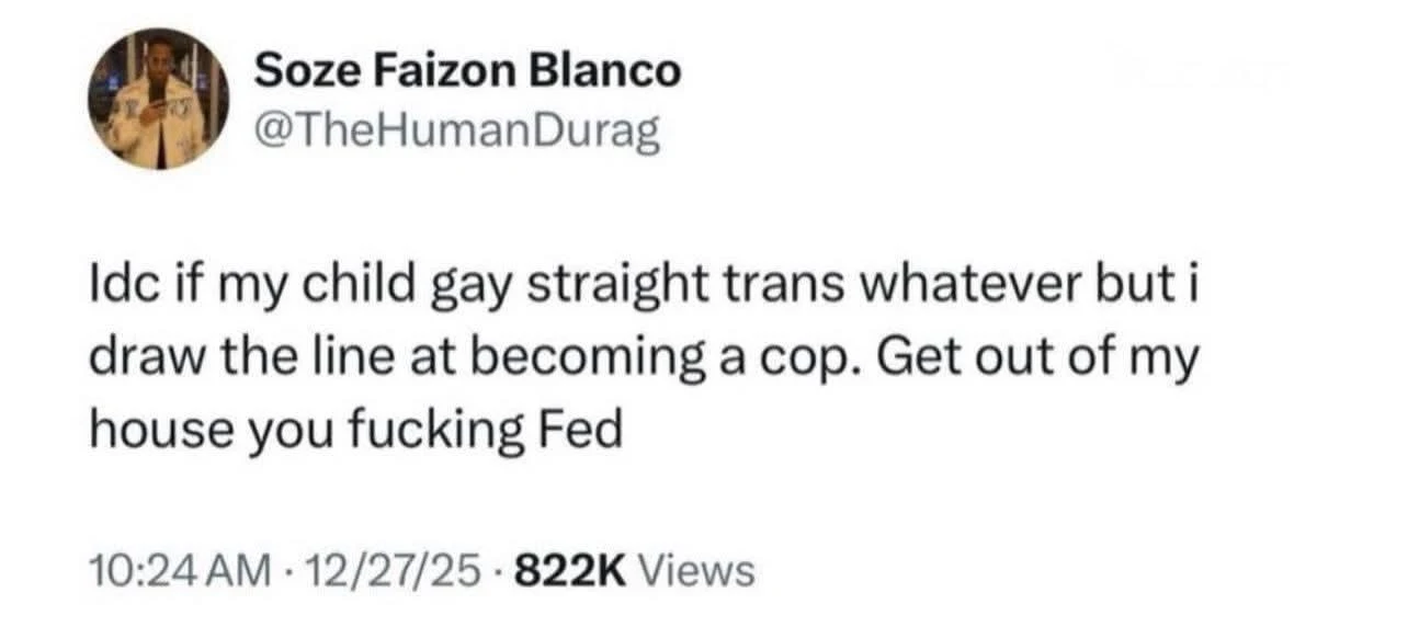 ah, that’s an interesting distinction - Black folks cannot avoid their fate as Black, but cops absolutely can choose a different profession.
