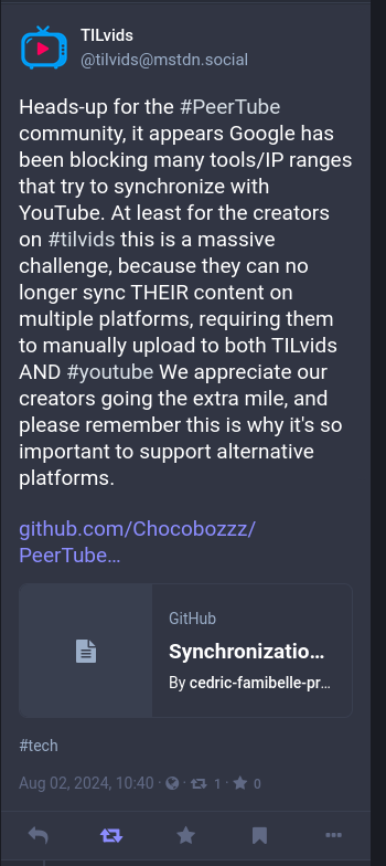 I’m a YouTube creator, part of the partner program, and I also manually upload to TILvids. The videos I make generate about $100-$300 a year through the partner program, so I’m not a professional by any means. It feels like they’re trying to keep creators from leaving by putting up small roadblocks that limit our reach beyond the platform. Given PeerTube’s non-profit model, I see it as a potential future for content sharing. Though there are a few rock stars on YouTube, most of the creators on that platform make little to no money from publishing videos. There are more people like me than Linus Media Group.