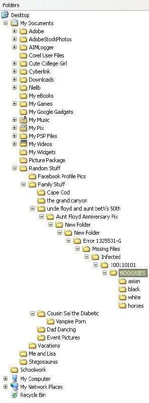 I had a maze of empty folders about 10 layers deep that eventually led to my porn cache. There was some good stuff in there, but I’m sure my fan speed spiked sporadically as a result.