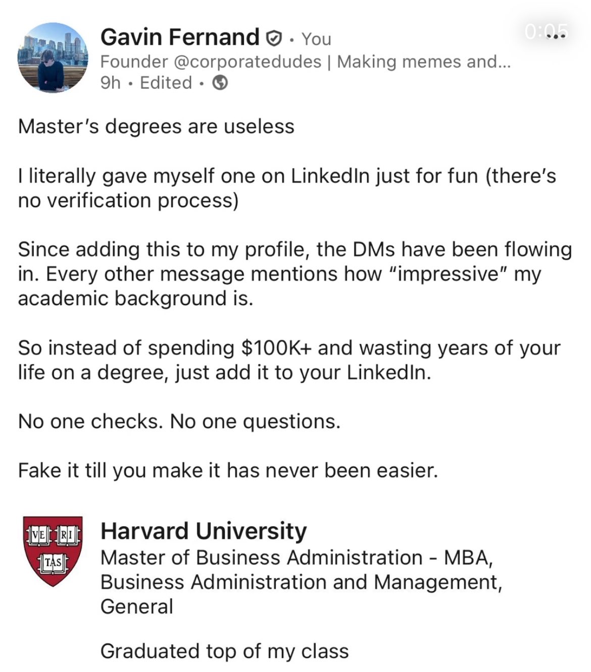 Don’t lie about stuff that is easy to verify like a degree from Harvard. That is just asking to be blackballed.