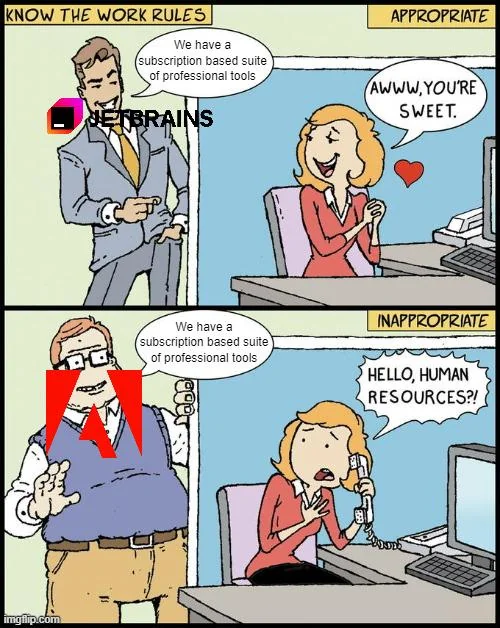 minus-squareFriendlyBeagleDog@lemmy.blahaj.zonelinkfedilinkarrow-up0·1 year agoSubscription-based models are a plague, but at least Jetbrains products eventually offer a perpetual fallback license for if you stop paying. It’s absurd that Adobe can just take tools you might depend on away after years of paying the subscription.