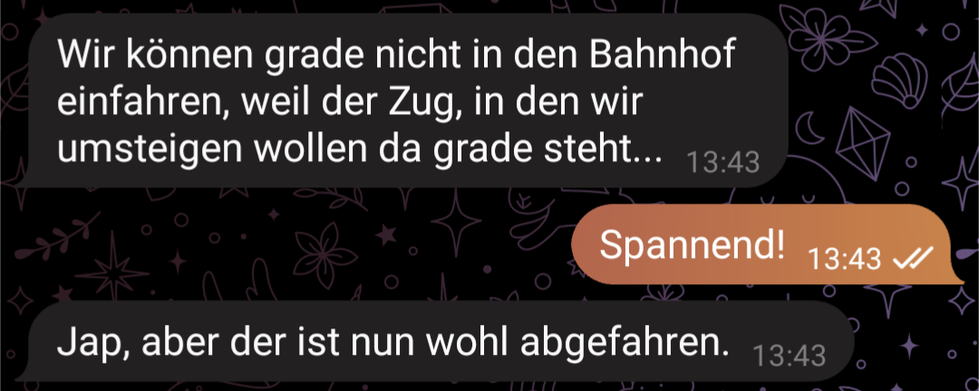 Meine Freundin hatte da was ähnlich schönes: ihr Zug hatte Verspätung direkt vorm Bahnhof, weil auf dem Gleis der Zug stand, den sie als Anschluss nehmen musste. Nunja, hätte nehmen müssen.